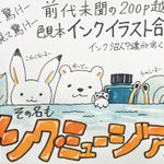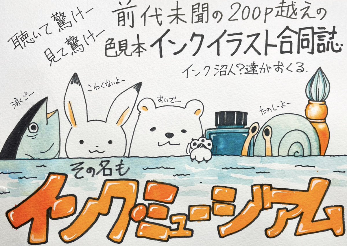 主催の典嶂さん(@Tensho2l4 )と四天王🐻❄️🐰🐌🐟に許可貰ったのでインクイラスト合同誌「インク・ミュージアム」の宣伝用POP掲載。 #インクイラスト合同誌 #インク・ミュージアム #インク沼 #リツイート希望 #四天王は動物