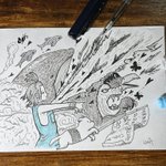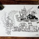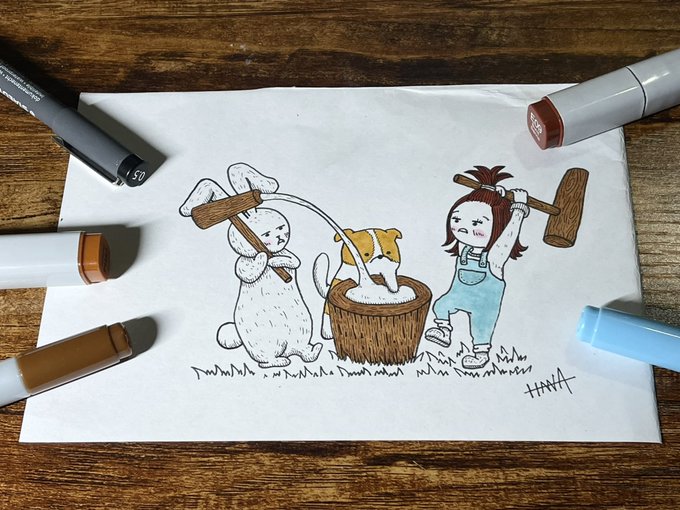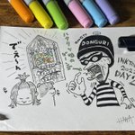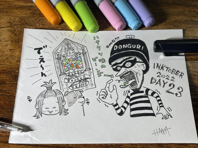 #inktober2022 本日のお題【鼻くそ】 昨日おやつを奪われた仕返しに鼻くそ味のビーンズを強盗さんに食べさせるリトルハナとちくわ。お味やいかに?! #inktober2022day23 #イラスト #ペン画 #リトルハナ このイラスト描いてたらユニバ行きたくなってきたー おやすみなさーい
