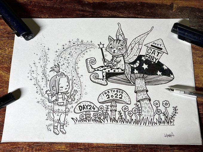 カコウフォレストには不思議な猫の妖精キャットフェアリーが住んでいる。この妖精の魔法の粉をふりかければ、どんな相手でもその顔、髪型、性別でさえも自由に変えてしまうことが出来るのだとか。 #inktober2022 #inktober2022day24 #イラスト #ペン画 #リトルハナ