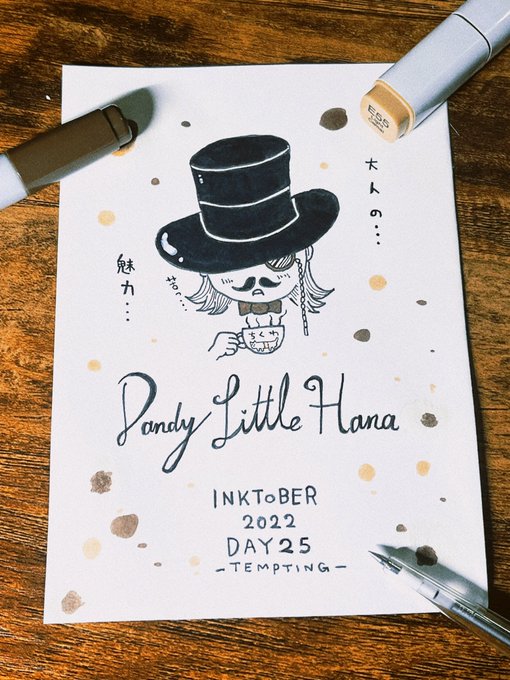 #inktober2022 の25日目のお題は【魅力的 TEMPTING」 昨晩カコウフォレストに住むキャットフェアリーに魔法をかけられたリトルハナはダンディな姿へ大変身。はたして大人の魅力を醸し出せてる?のか? #inktober2022DAY25 #イラスト #ペン画 #リトルハナ #ダンディリトルハナ