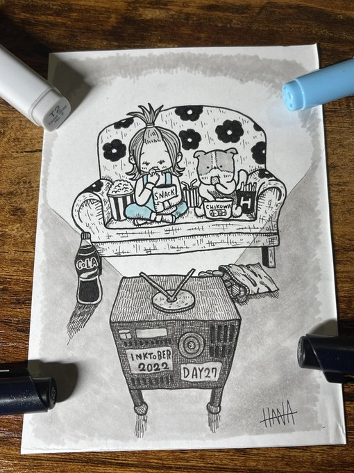 #inktober2022 27日目のお題 【スナック snack】 金曜の夜は平日頑張ったご褒美に、スナック菓子食べながら夜更かしするの #inktober2022day27 #イラスト #ペン画 #リトルハナ ※描いてる本人はペン握りながら眠気と戦ってるって所がこの作品の見所っす ってことでおやすみー 皆様良い週末をー