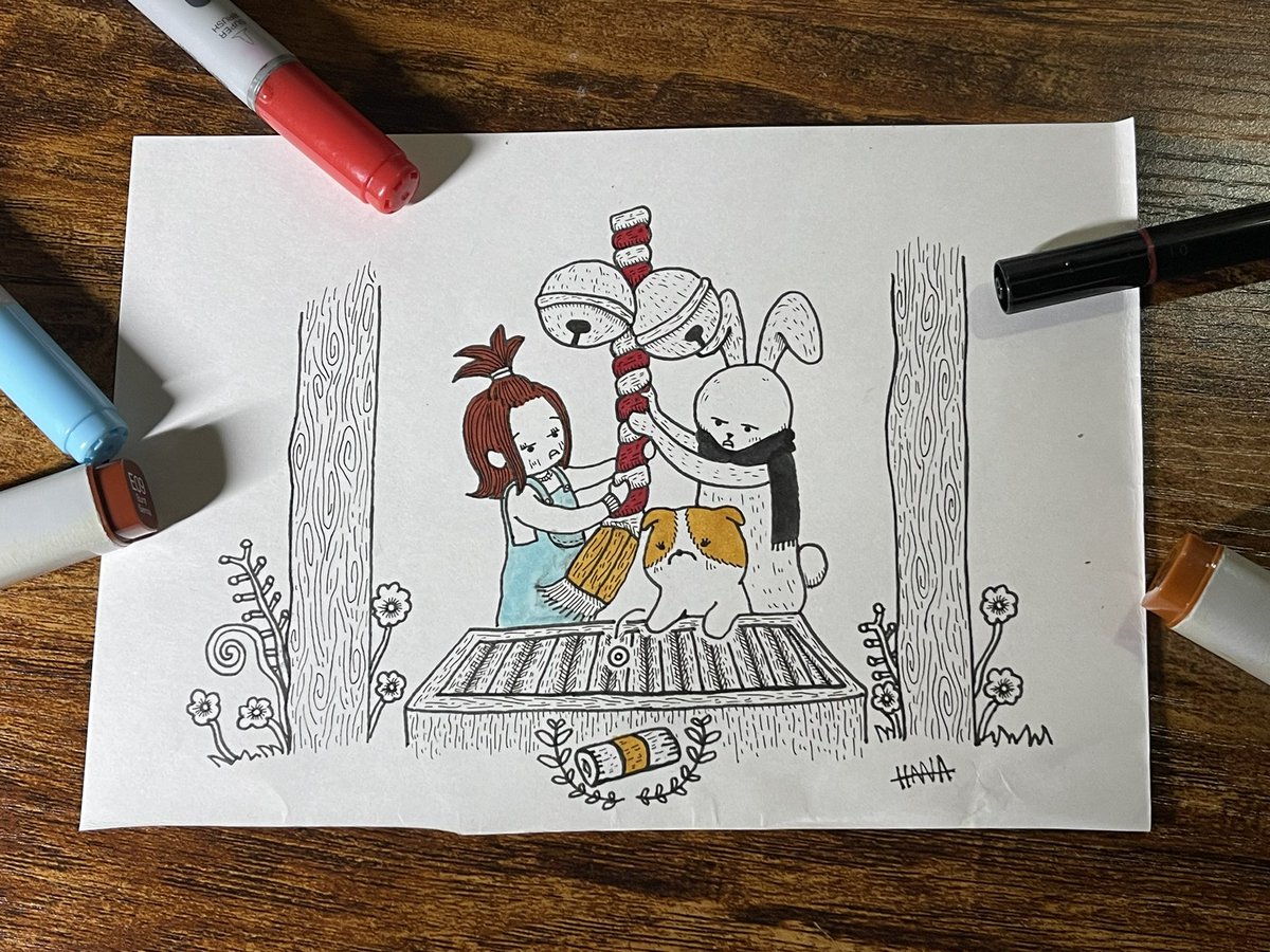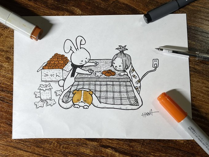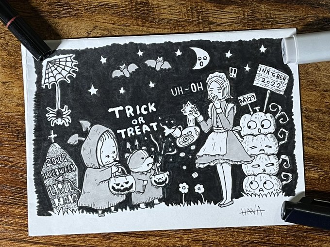 #inktober2022 29日目のお題 【おっと UH-OH】 ミドルハナにお菓子をもらいに行ったら思ったより驚かれたリトルハナとちくわ ハッピーハロウィーン🎃 &おやすみー #inktober2022day29 #イラスト #ペン画 #リトルハナ #ミドルハナ