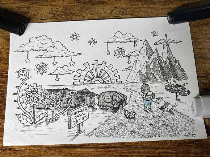 #inktober2022 30日目のお題 【歯車 GEAR】 今は空回りしてても、いつか歯車がガチッと噛み合ってぐーって前に進めるさ!知らんけど! おやすみーっ! #inktober2022day30 #イラスト #ペン画 #リトルハナ #バーチャルモデルアーティスト