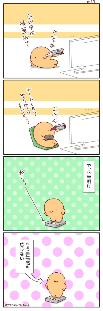普段絶対しないから「うわー朝から飲んじゃってるよウヒヒー」って感じで謎のテンションが爆上がりでしたよ! ほいでもってGW明けの体重も爆上がりってなー! 脂肪め!減れ!脂肪めーーーーー!!! 今までの作品はこちらから→ameblo.jp/menon-blog/ #リバウンド #4コマ #漫画が読めるハッシュタグ