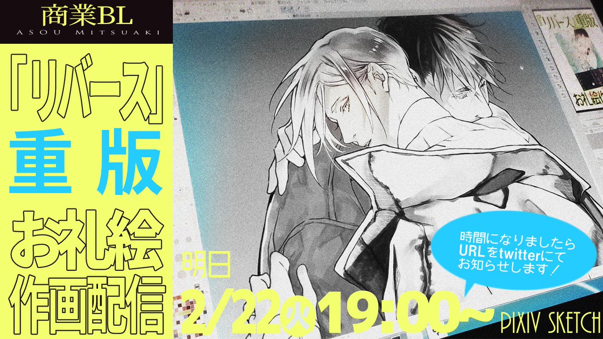 🎀𝗧𝗛𝗔𝗡𝗞𝗦🎀 RT>『#リバース』2回目の重版が決定しました! 夢のようです…。お手にとって下さった皆様のおかげです。 本当にありがとうございます!𓅼✨ ◤📺 作画配信 📺◢ お礼絵の作画&直接お礼を言いたい配信ですˎˊ˗ 【日時】明日 𝟮/𝟮𝟮(火) 𝟭𝟵時~ 【場所】𝗣𝗶𝘅𝗶𝘃 𝗦𝗸𝗲𝘁𝗰𝗵 twitter.com/GUSH_info/stat…