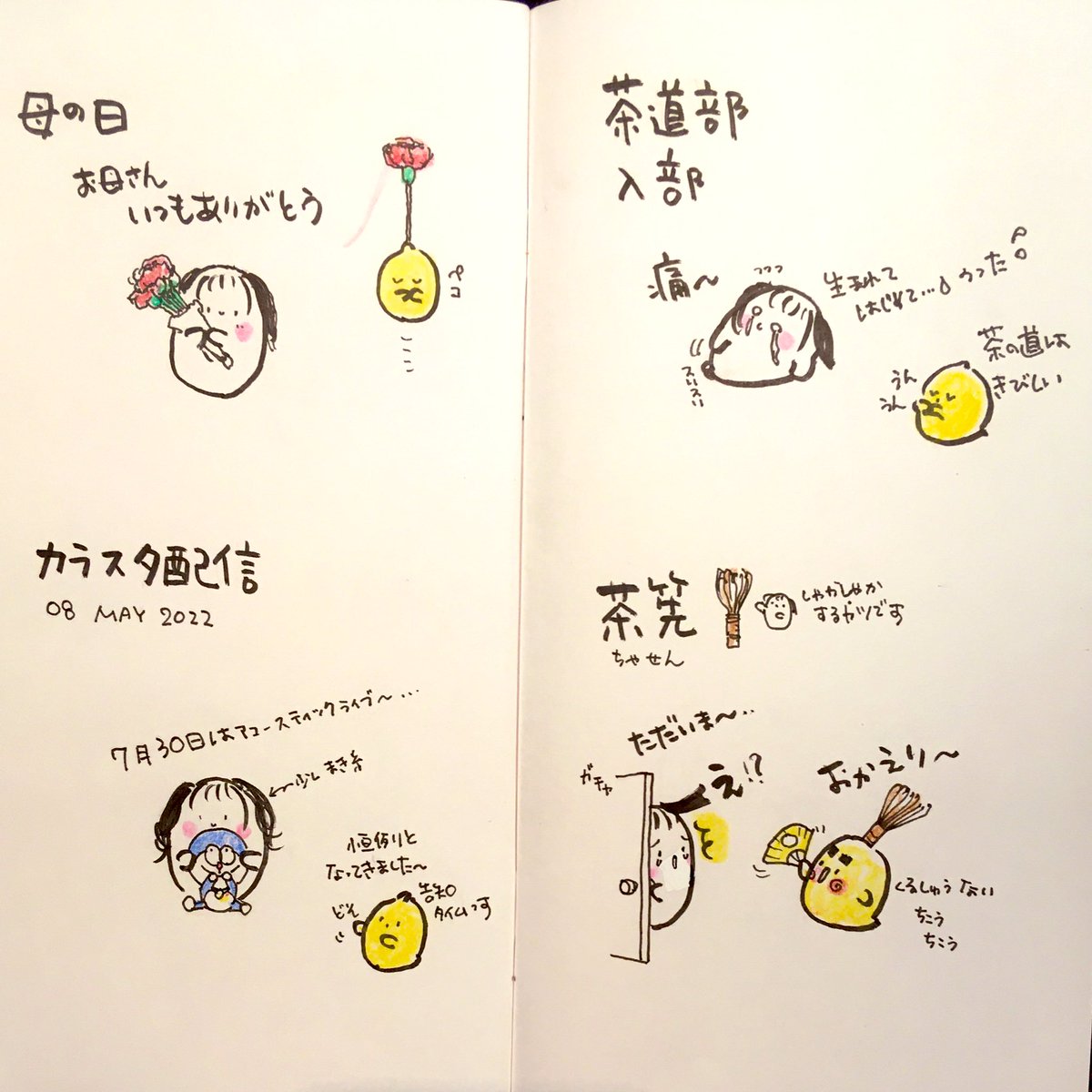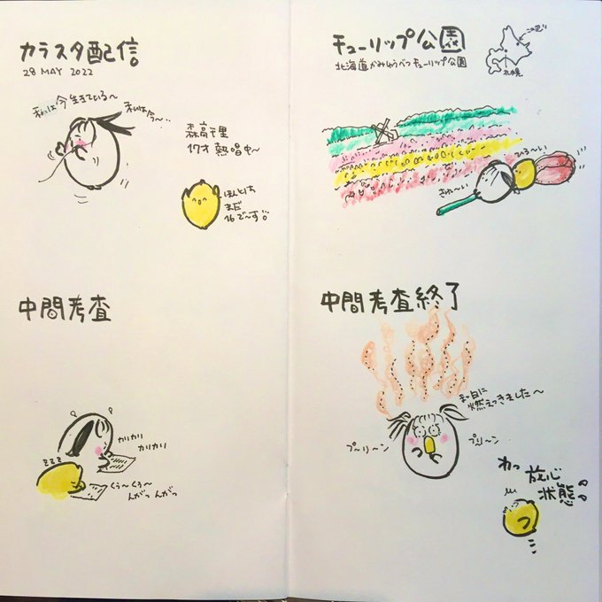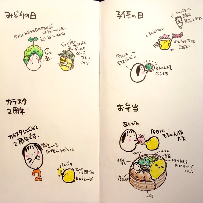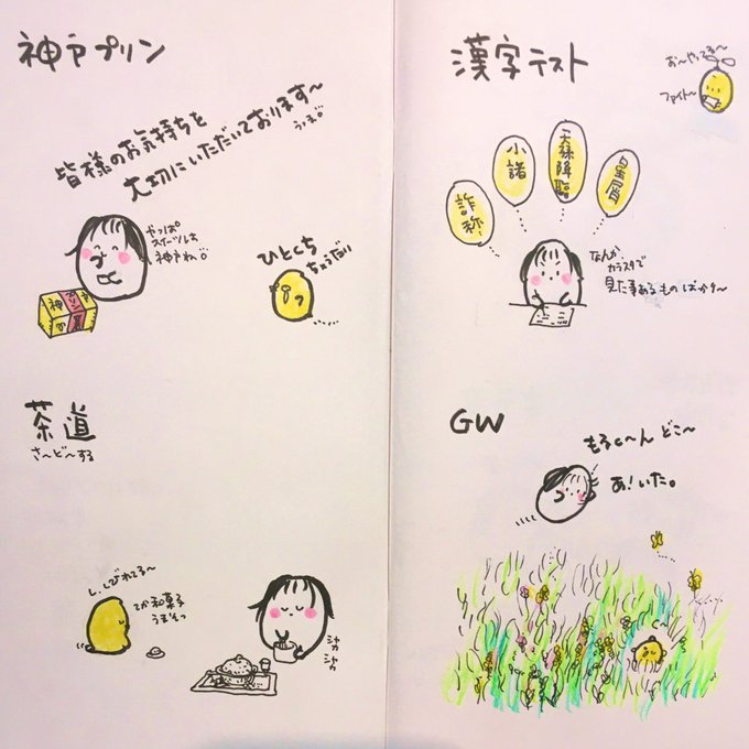 見開きアーカイブ6月 JKになって 何かと忙しいリアルこもたん。 どんなJK生活がスタートしたのかな? 5月前半16枠分からどうぞ🍑🐤 #お気に入り教えて下さい 🍑使用画材 #トラベラーズノート #リフィル003 #呉竹筆ペン #コピックマルチライナー #ファーバーカステル水彩色鉛筆 #三菱鉛筆B #イラスト