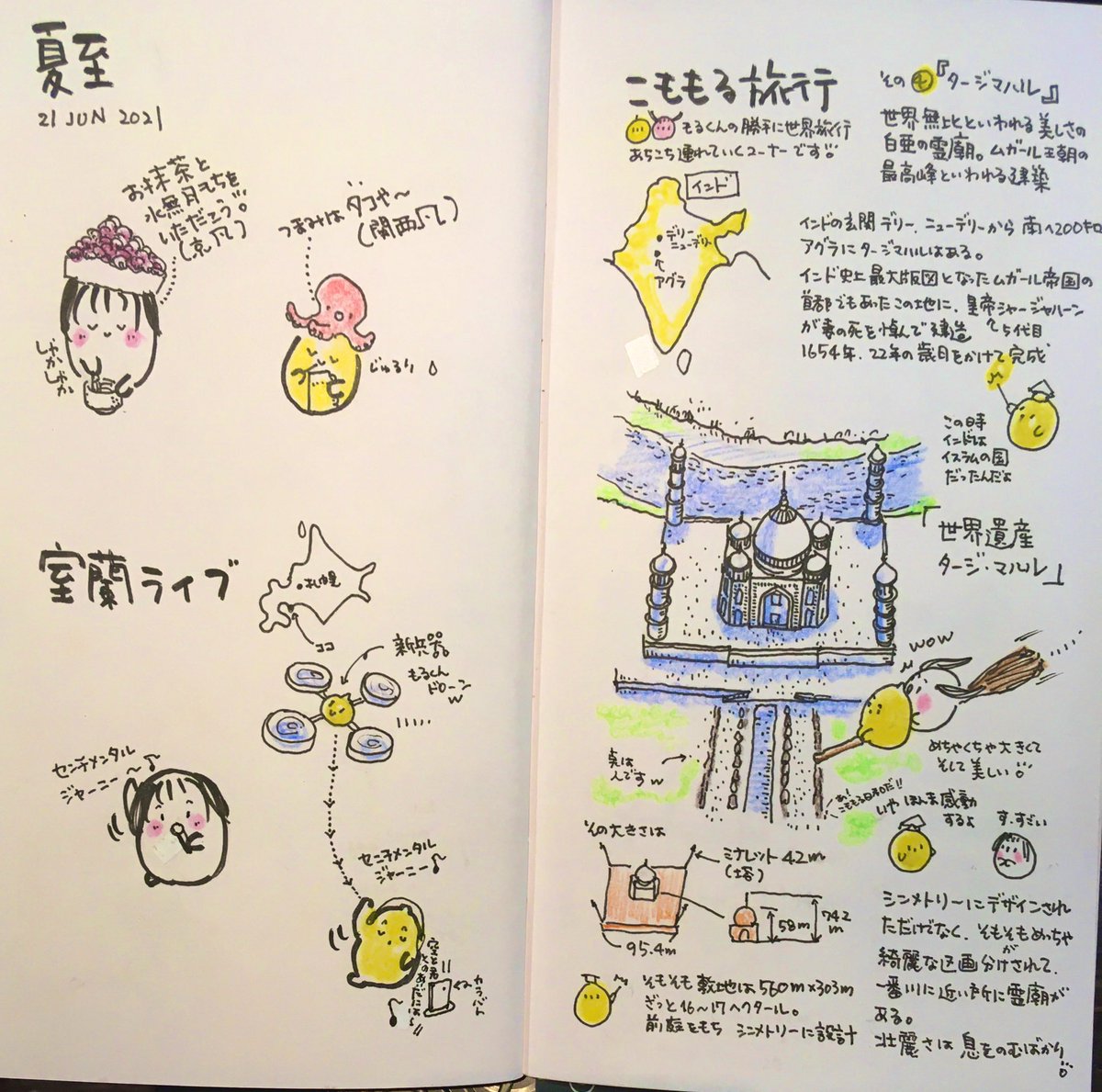 見開きアーカイブ6月後半12枠 7月より こももる日和は 早朝更新に変更いたしました🍑🐤 #よかったらお気に入り教えて下さい 🍑使用画材 #トラベラーズノート #リフィル003 #呉竹筆ペン #コピックマルチライナー #ファーバーカステル水彩色鉛筆 #三菱鉛筆B #イラスト