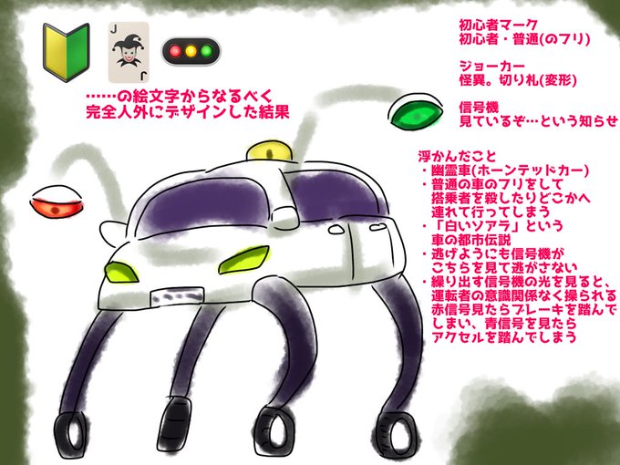 【デザイン・落書き】 「🔰🃏🚥」でなるべく完全人外にデザインしました。二つが車関連の要素なので、それに引っ張られてしまいました ……その車は、搭乗者を恐怖に陥れる #リプきた3つの絵文字でキャラデザする
