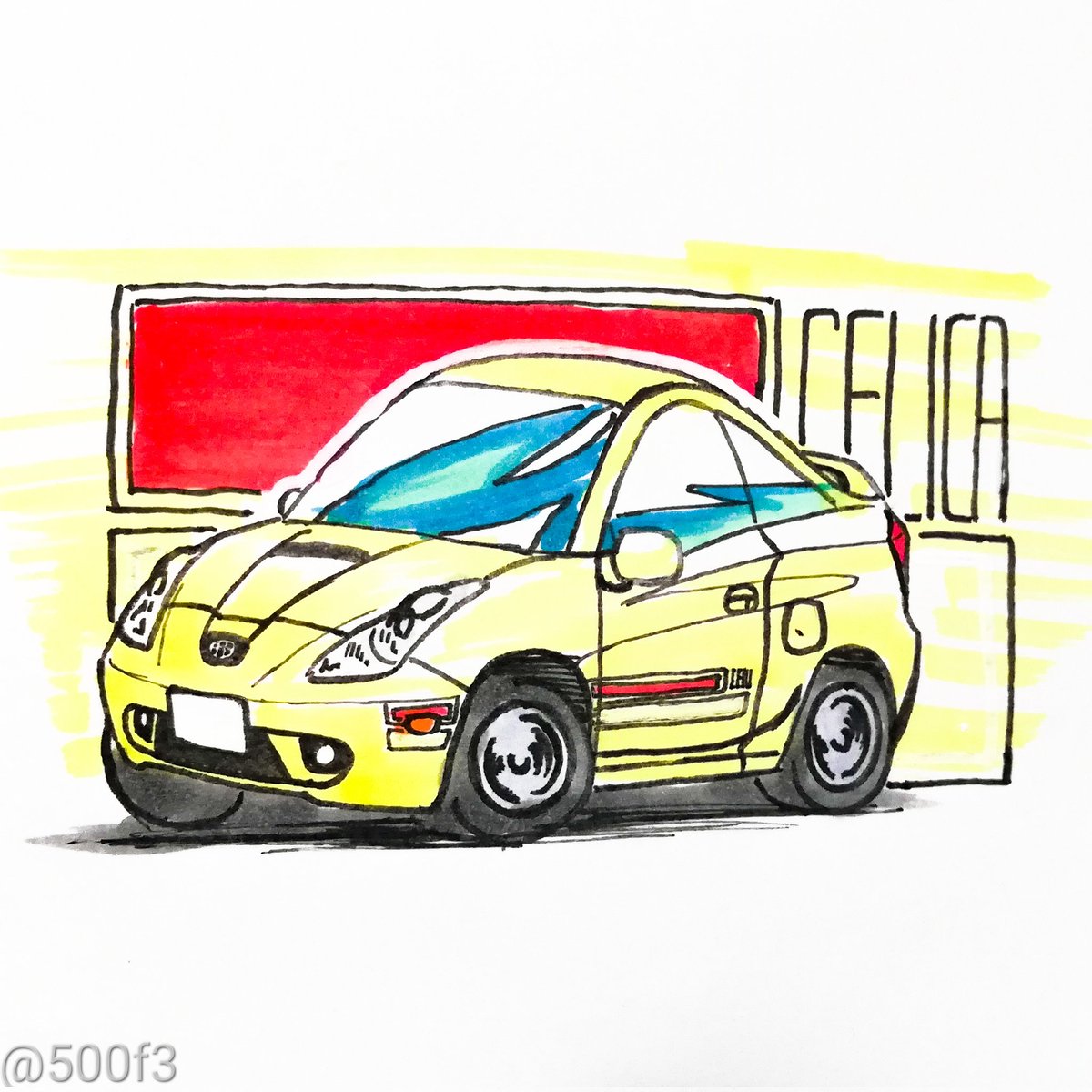 #リプできた車をザザっと描く 最終セリカを描きました。いつもよりチョロQ風ですね。 ダサいとアヴァンギャルドをキワッキワに攻めてるこのクルマ、嫌いじゃないんですよね。初代が出たときもこんなインパクトがあったのかな…と思いストライプを入れてみましたが、蛇足だったかも??