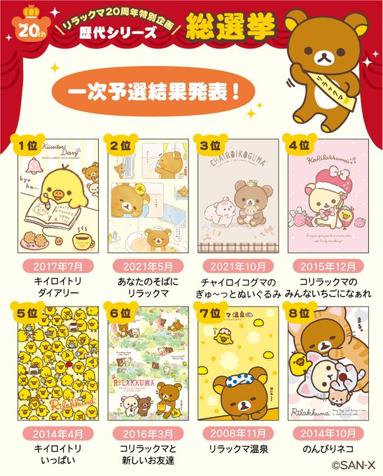 リラックマ20周年記念 歴代シリーズ総選挙1次予選結果発表✨ 上位8シリーズが決選投票へ進出します! ブログでは20位までの順位も発表しています♪ 詳しくはこちら🔽 san-x.co.jp/blog/rilakkuma… #リラックマ20周年歴代シリーズ総選挙