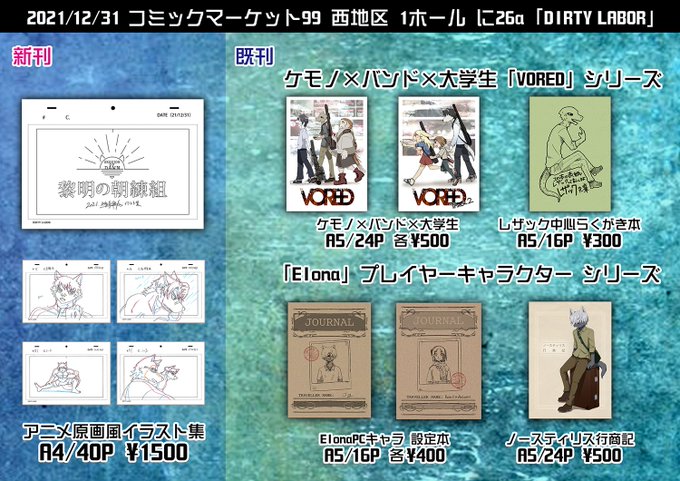 8/13(土)東E02b「DIRTY LABOR」おしながきです! 新刊はアッシュの写真集とバンドキャラ設定本です! どちらも少部数ですが通販もあります! 【新刊予約はこちら】 dirtylabor.booth.pm/items/4013316 dirtylabor.booth.pm/items/4075549 #C100新刊 #C100 #リレイトレッカー 交換可! #夏コミ新刊間に合うのかヒサヒト