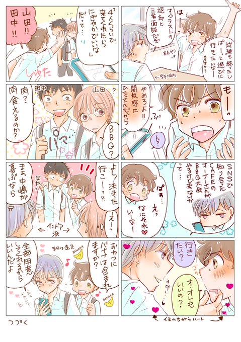 おはようございます🍉 先日お知らせした合作 #いもチコBBQ漫画 1P目です! なかよしくんとその友人山田中も交えてのBBQ大会参加! 主催のカフェオーナーさんとは💕? 心踊る4人(一部) 次回いもさん@1i10mo9パートに続きます。 #リレー漫画 #漫画が読めるハッシュタグ #いもチコ合作企画