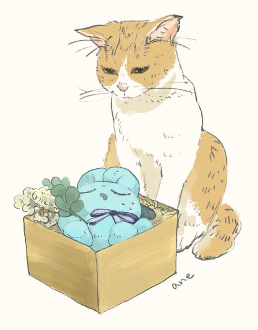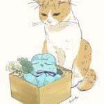 我が家にやってきたましゅもっちツノリムル…友人からのプレゼント。すてきな箱に、みちみちに入っていました。 出るに出れない様子…先住センパイを寝たふりでやり過ごす…! #リヴリーファンアート 🐈