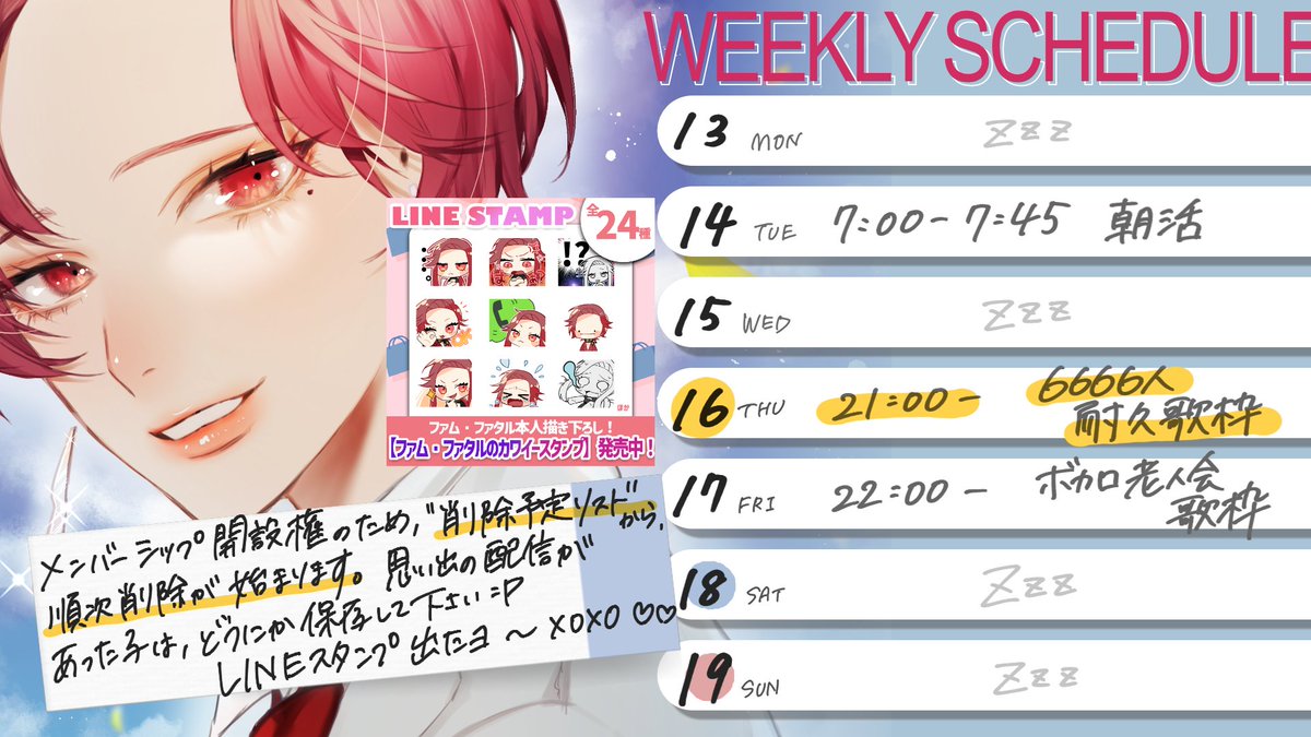 🐍今週の予定表💄 YouTube📺 youtube.com/c/FemmeFataleC… TikTok🎬 tiktok.com/@femmefatale_vt 🖼️FA #ファム美術館 ❣️総合・配信用 #ルックアットファミー 最新情報が届く公式LINE✉️ lin.ee/TMfJZTk LINEスタンプ発売中💭 line.me/S/sticker/1972… グッズやボイス🎁 femmefatale777.booth.pm
