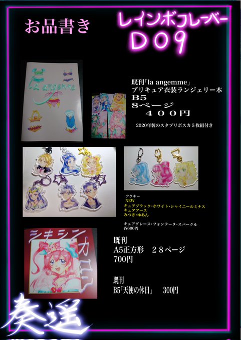 10/2開催レイフレ27のお品書きです! お肉アンソロは後日通販も予定してます。 ※見本に触れる際は手指消毒をお願いします。 #プリキュアお肉アンソロ #レイフレ27 #レインボーフレーバー27 ↓以下、ツリーに発行物のサンプル(続く)