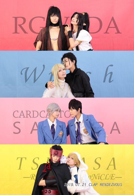 #レイヤーさんは同じ日にやった複数キャラのコスプレ写真を貼ってください 以前オンリーでお配りしたポストカードの写真ですが、背景の模造紙の切り貼り含め三脚で1日バタバタで撮りましたね 夜叉王、黒耀、桃矢、黒鋼→テオ 阿修羅、翡翠、雪兎、ファイ→桜也