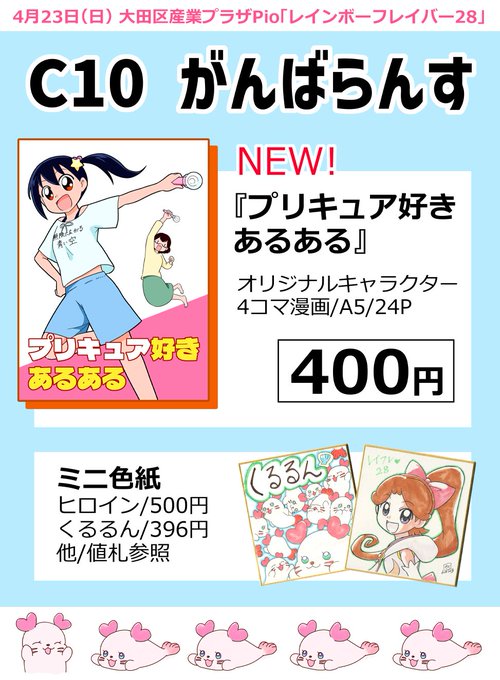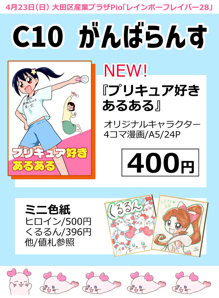 4月23日レインボーフレーバー28のお品書きです。 4コマ漫画『プリキュア好きあるある』が本になりました!! 【C10】スペースでお待ちしてます。よろしくお願いします。(※リプ欄にサンプルページ掲載) #レイフレ28 #レインボーフレーバー28