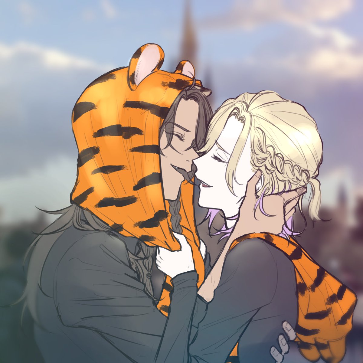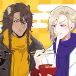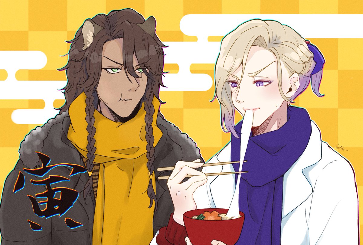 #レオヴィル深夜のワンドロ・ワンライショー 1ミリもワンドロではないのですがせっかくなので!!🙏 お題『寅』お借りします!虎柄T😌 レオヴィルくん🦁👑 お雑煮のお餅をうまくかみ切れない👑くんと、うまくのみ込めない🦁です🤣 あけましておめでとうございます!!🎍✨