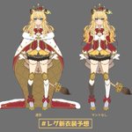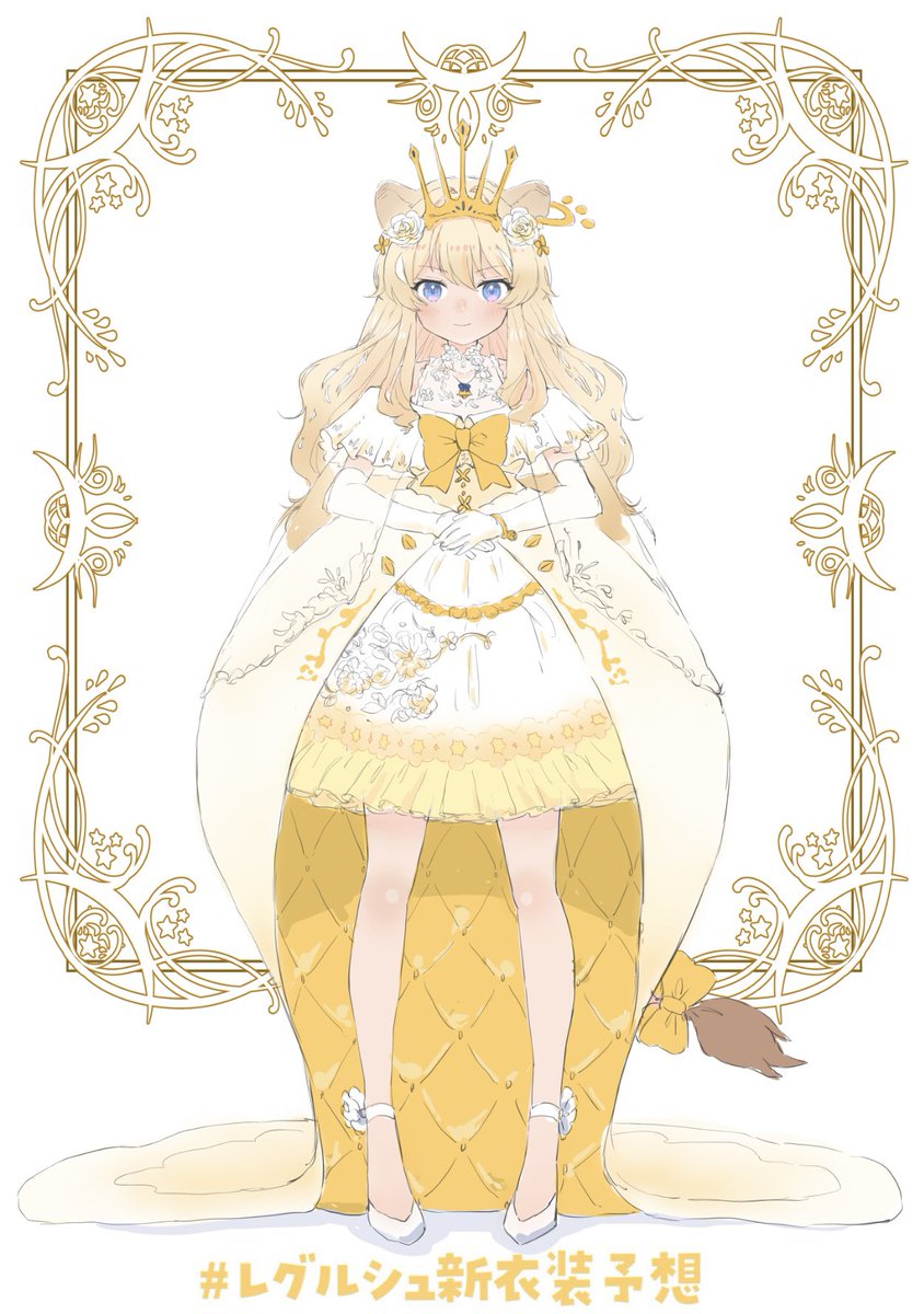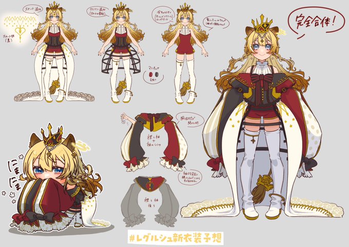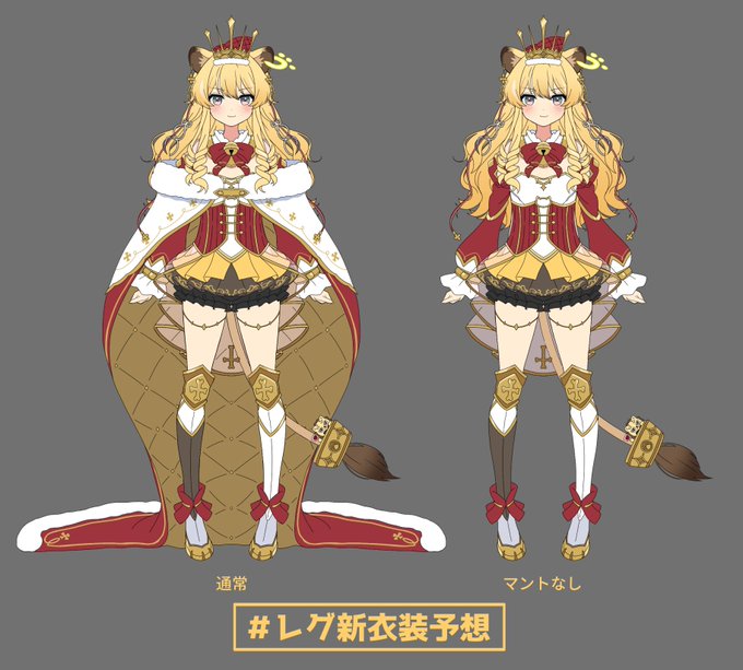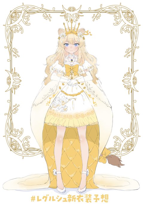 ライオンハート王家の正装っぽい新衣装を予想してみました。 最初は戴冠式のときに着るマントかなとか、6月だからもしかしたらウェディングドレスかも…と色々考えましたがこうなりました。 頭にあった謎の膨らみは謎が解けなかったので見なかったことに…(((( ˙ᵕ| #レグルシュ新衣装予想