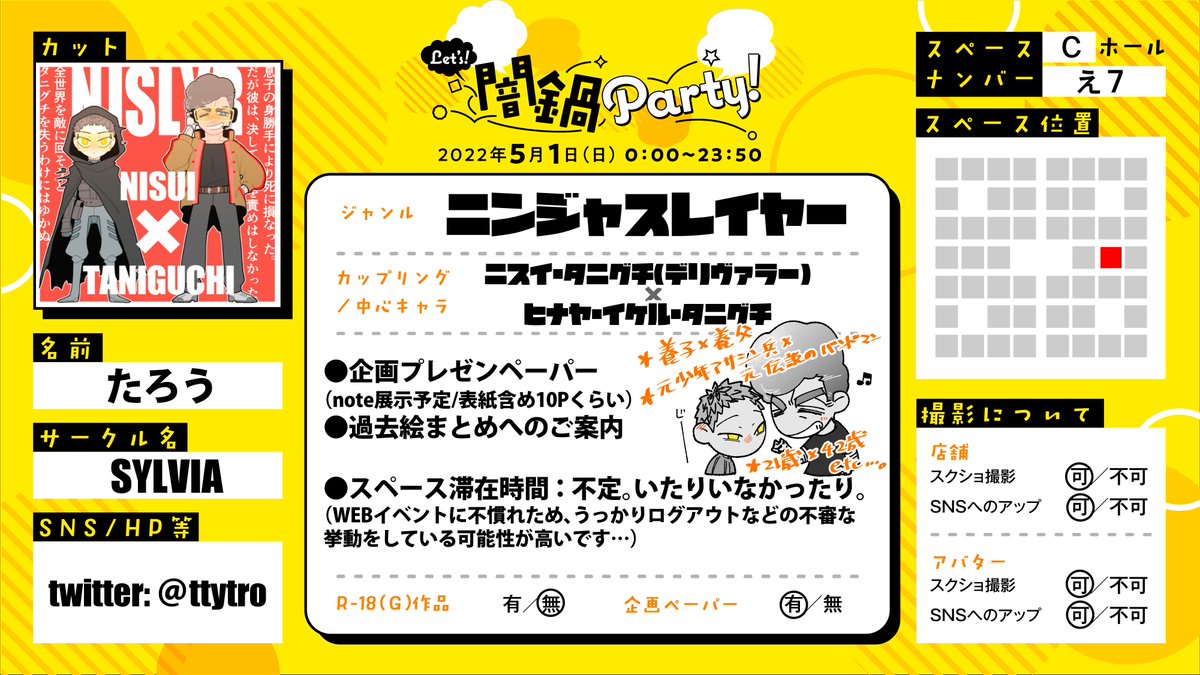 ★2022年5月1日(日)開催 Let's!闇鍋Party! pictsquare.net/lk818dh7po1ixq… スペース:Cホール【え7】SYLVIA ニンジャのニスタニで参加させて頂きます~!企画ペーパー展示と、既存pixivページへのご案内程度の展示となりますが、どうぞ宜しくお願い致します💪🦔💪 #レッツ闇鍋