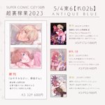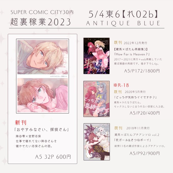 5/4超裏稼業2023お品書きです! 東6ホール れ02-b「ANTIQUE BLUE」 新刊は降志、既刊は他ジャンル(蔵ぼ)です。 プチオンリー「LADY of GRAY」にも参加してます! 既刊のサンプルはツリーにつなげます! pixiv.net/artworks/10770… #レディオブグレイ twitter.com/yuzuto_antique…