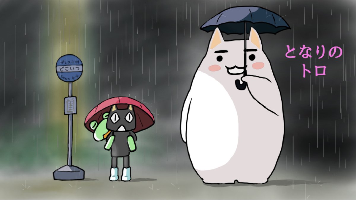こんにちは(^^) 今日も雨降りですね☔️ 私は休日なので お絵描きしてました🐱🐸 皆さま良い一日を☕️ #どこでもいっしょ #となりのトトロ #レトロコンシューマー愛好会 #レトロコンシューマー愛好会イラスト部 6月のお題『雨』