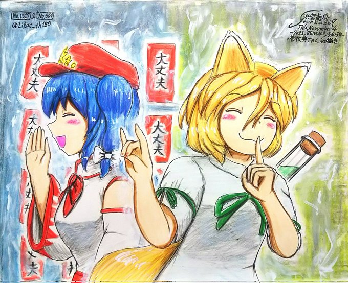 幺樂団用の小色紙その② ジャケ子さんとレベ子さん小色紙描きました! #幺樂団カァニバル #東方旧作 #ジャケ子 #レベ子 #蓬莱人形 #蓬莱人形ジャケットのあの子 #蓬莱人形初版レーベルのあの子