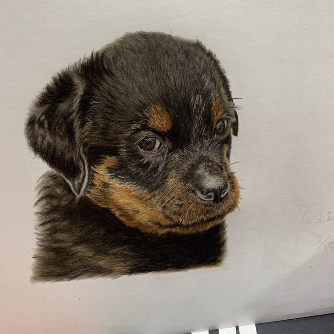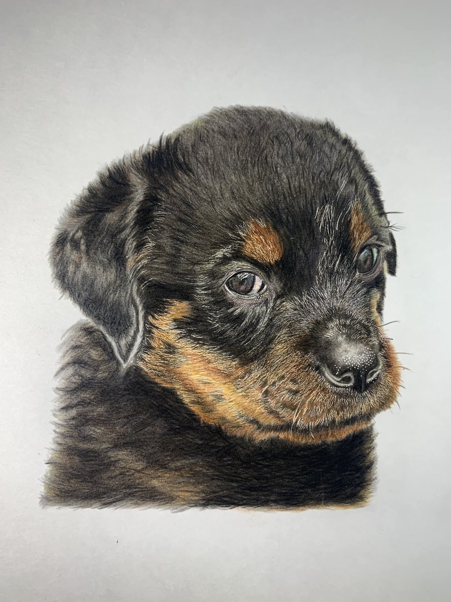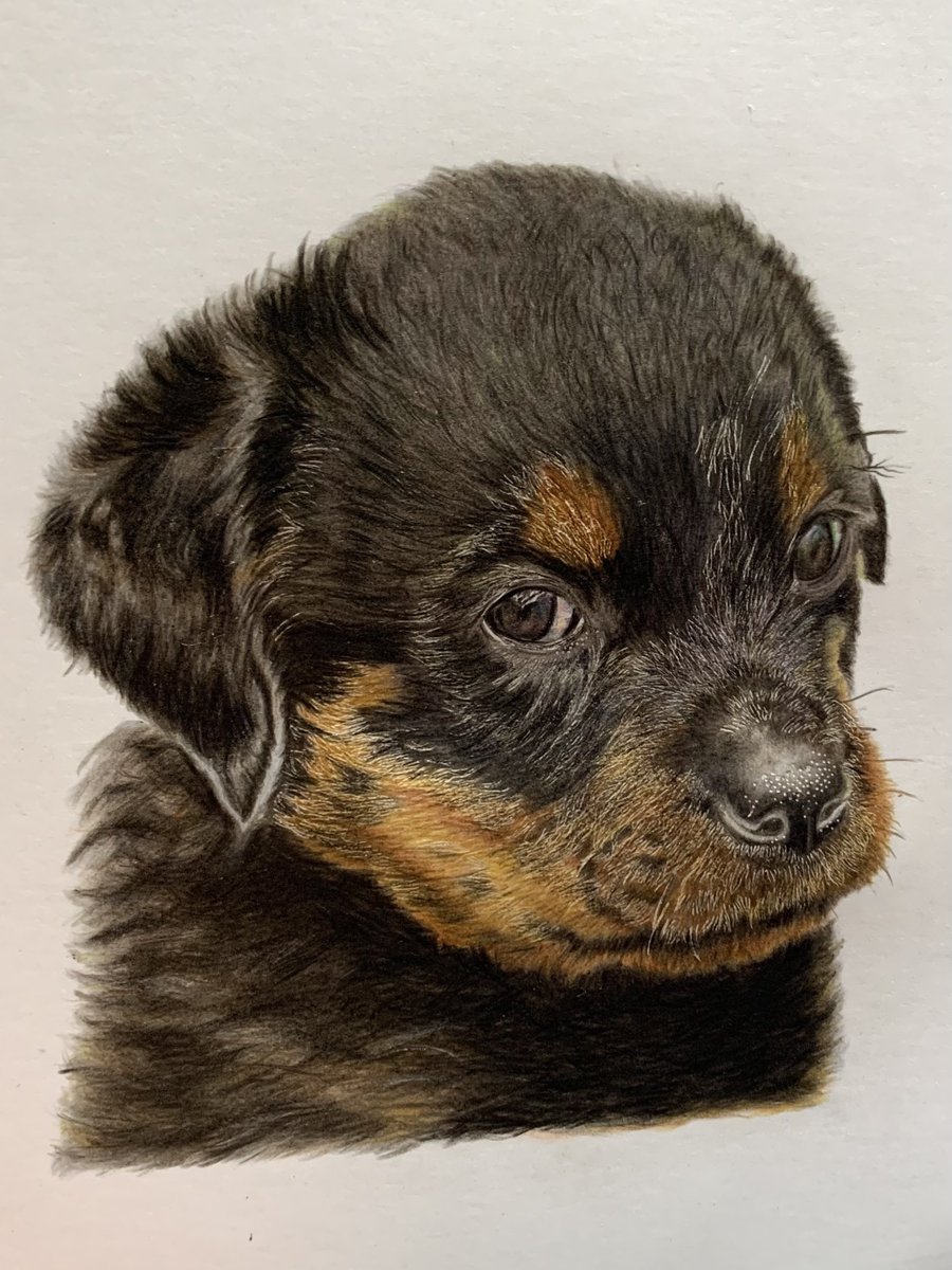 色鉛筆で描いた「子犬」🐶 ロットワイラーの子犬です✨ ぼんぼん先生の色鉛筆画教室のお題🧑🏻🎨 こう見えて、 大人になると警察犬や軍用犬にもなる立派なワンちゃん👮 #色鉛筆画 #色鉛筆 #ロットワイラー #犬絵 #colorpencil #colorpencildrawing