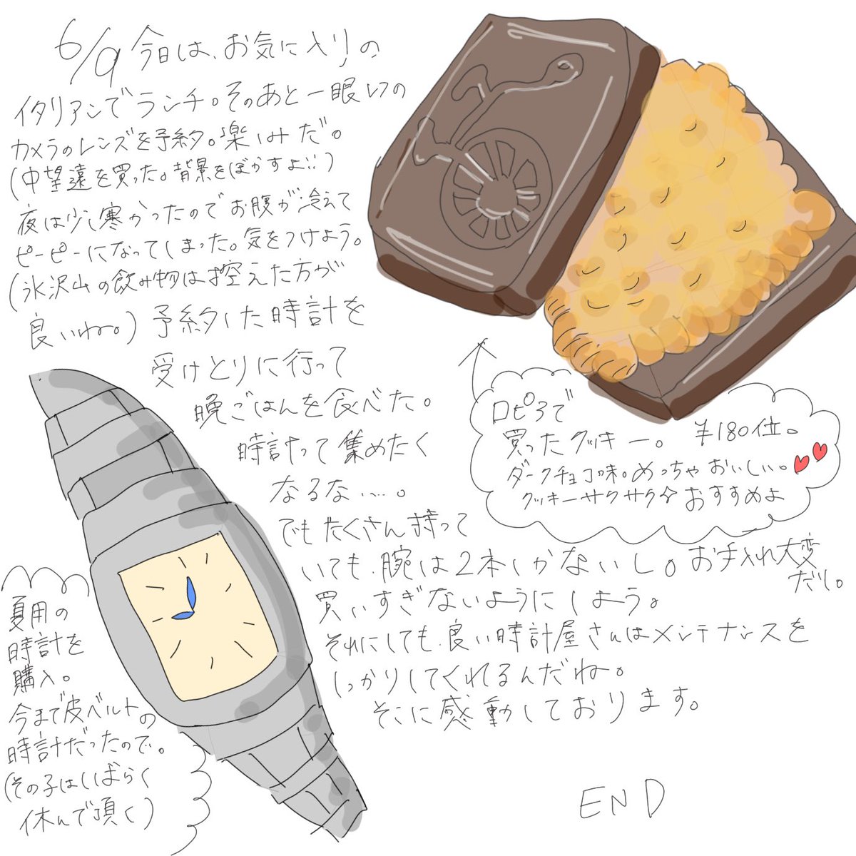 絵日記 美味しいクッキーはチョコレートフュージョンという名前 #時計 #ロピア #クッキー #エッセイ #マンガが読めるハッシュタグ #漫画 #イラスト #イラスト好きな人と繋がりたい #ハムスター #ハムスターのいる生活 #絵日記 #グルメ