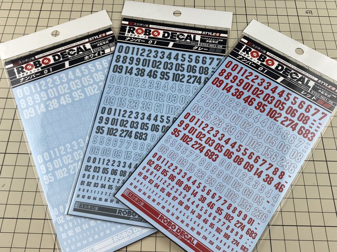 ロボデカール第2弾ナンバー01のサンプルを頂きました。シンプルでクセのない書体がどんな機体にも合いそう、シルクスクリーン印刷で隠蔽力も強いそうです。お値段も税込352円とリーズナブル、コレはオススメするしかない!! sujibori-do.ocnk.net/product-group/… #スジボリ堂 #ロボデカール