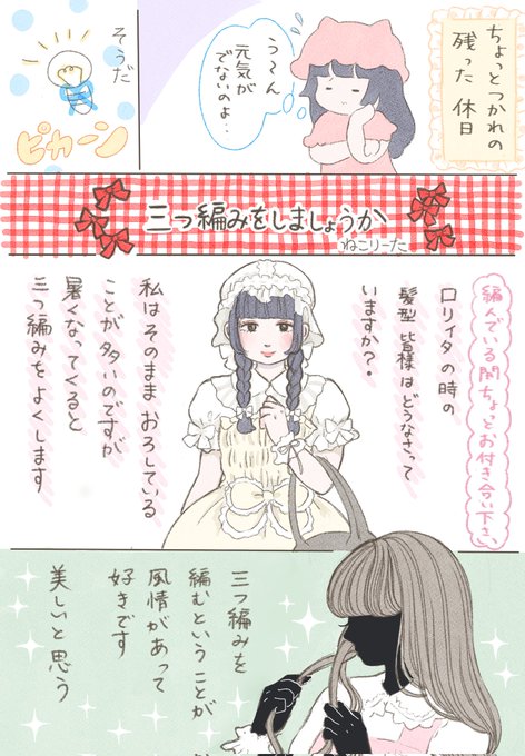 🌼三つ編みをしましょうか🌼 夏のロリィタは三つ編みで過ごすことが多くて…三つ編みに元気をもらった日のことを描きました✍️✨ 休日のお夜食のようにゆるりと楽しんでいただけたら嬉しいです☕よろしくお願い致します🎀 #ロリィタ #ロリータファッション #エッセイ漫画 #漫画が読めるハッシュタグ