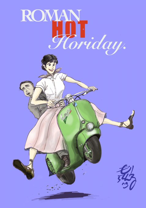 「ローマの熱い休日」 初年度公開が1953年。あれから約70年。 女性の社会進出は当たり前となり。 恋人や夫婦間に於いても😅チカラ関係は今や女性上位の割合が確実に増えています。 今回のイラスト。そんな現代の男女事情も踏まえ描いてみました😆 #ローマの休日 #オードリーヘップバーン #バイク