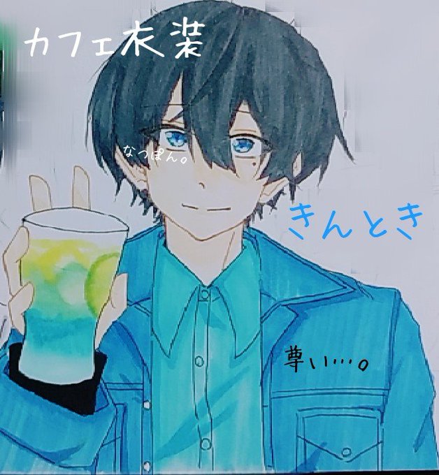 #ワイテルズコラボカフェ2022 明日カフェ行きます💙 カフェ衣装のイラスト、四人だけしか描けなかった💦 何かミスってる、目かな? コピック初心者なので、色が変に……。 #イラスト #コピック #ワイテルズ #ワイテルズ好きさんと繋がりたい #しろっぽ #ワイテルズカフェ #ワイテルズコラボカフェ