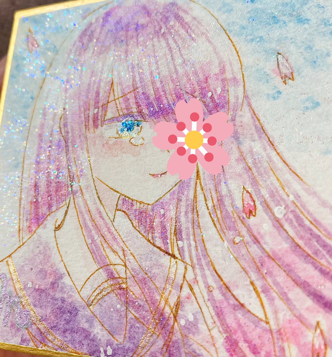 明日、下北沢で開催の #笑う門出に春来たるッ で委託販売するミニ色紙は角度を変えるとキラキラ光ります✨☺️ 是非色々な角度から見ていただけると嬉しいです🌸 #ワラハルッ #絵描きさんと繋がりたい #アナログ絵