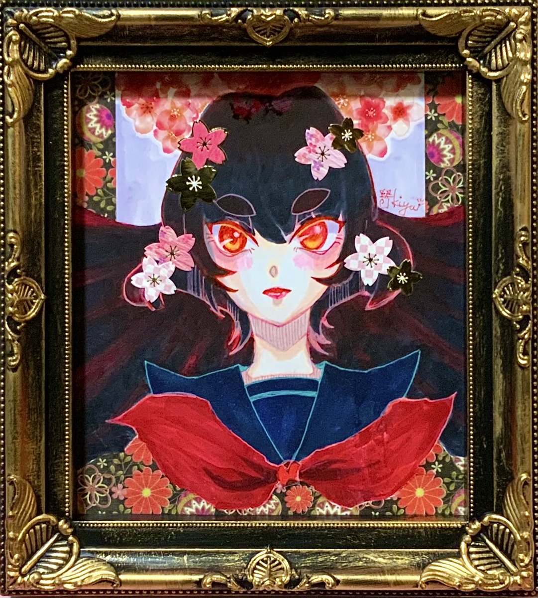 3/26に下北沢で行われるアートイベント用のグッズとして。黒い額込みの小色紙サイズ、新作「桜纏う赤姫」。艶やかでミステリアスな和美人です🌸🌸🌸 2000円(予定) #ワラハルッ #笑う門出に春来たるッ #イラスト #アナログイラスト #イラスト好きな人と繋がりたい #絵描きさんと繋がりたい