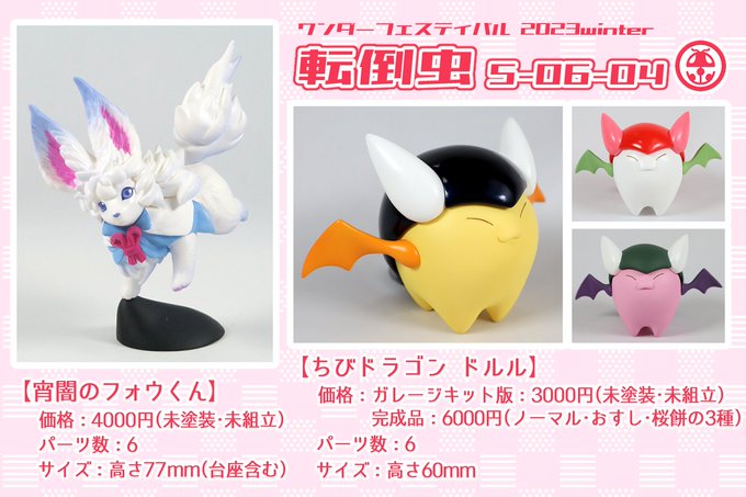 ワンフェス2023冬のお品書きです。 ・宵闇のフォウくん:4000円(未塗装・未組立) ・オリジナルちびドラゴン ドルル ガレキ版:3000円 完成品:6000円 商品が少なくなってしまいましたが、よろしくお願いいたします。 #wf2023w #ワンダーフェスティバル #ワンフェス