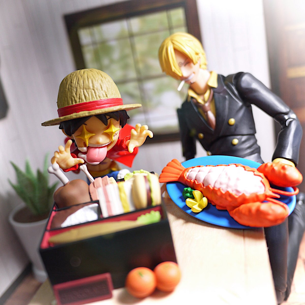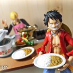 #夜のフィギュア撮影会 11/19 お題 『進化』 ルフィがサンジにカレーの作り方を習ったようです。 ナミ「すごい!生ゴミから食べ物に進化したじゃない!」 ルフィ「お前言い方失礼だな…」 #onepiece #monkeydluffy #nami #sanji #VAH #SHFiguarts #ワンピ飯 #ガチャガチャ #カプセルトイ