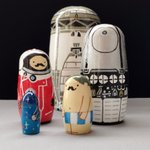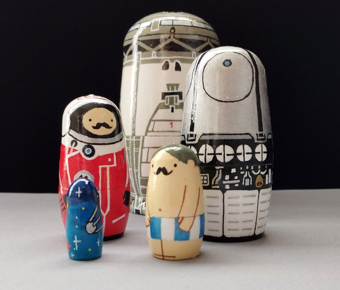 ボストークマトリョーシカ 人類初の有人宇宙船を模したマトリョーシカです 1 打ち上げロケット 2 有人衛星船ボストーク号 3 宇宙服を着たヒゲのおじさん 4 宇宙服を脱いだヒゲのおじさん 5 無限に広がる大宇宙&人工衛星スプートニク の順番に内蔵されてます #wf2023w #ワンフェス2023冬
