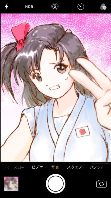 本日5月12日はワーヒーのリョウコさんの誕生日なので、昨年ラク描きしたタイムマシンで現代に来て初めてスマホで自撮り体験するリョウコさん📸 当時はカメラ付きケータイすら無かったからね😅 #ワールドヒーローズ