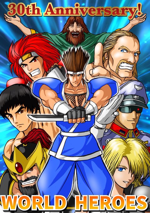 本日9月11日はNEOGEO家庭用ゲームソフト #ワールドヒーローズ が発売された日で、今年でちょうど30年! このゲームがあってこそ、WH2や2JET、パーフェクトも生まれました😂 先日の業務用に引き続き集合イラストでお祝いします🎉 センターハンゾウ! #ワールドヒーローズ30周年