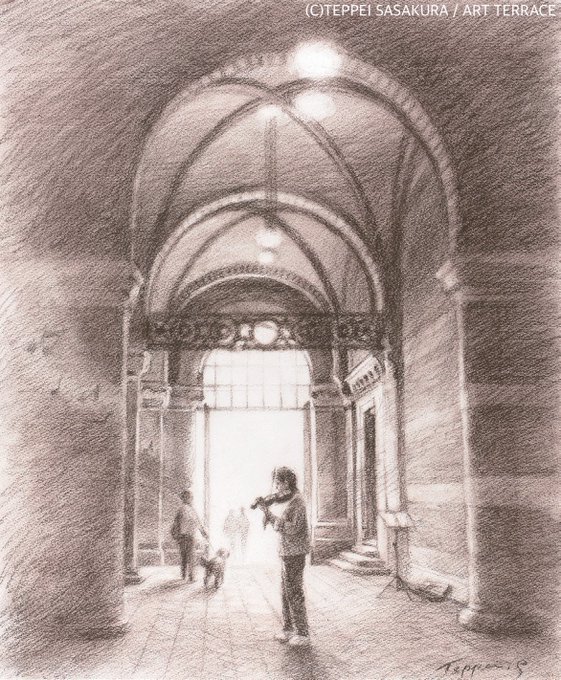 🎵原画(#コンテ)を展示中 笹倉鉄平 Teppei Sasakura 『美術館前の響きの良いアーチの下が僕のステージ~His Stage is Under the Archway~』 2019年 笹倉鉄平ちいさな絵画館 kaigakan-teppei.net #笹倉鉄平 #絵 #音楽好きな人と繋がりたい #ヴァイオリン好きな人と繋がりたい #ヴァイオリン