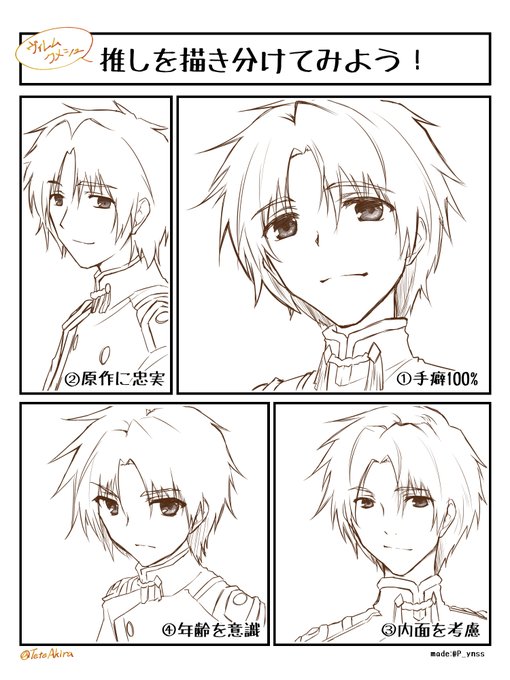#推しを描き分けてみよう なるものを見つけて枠をお借りしました! ②の原作忠実はアニメ版寄せ ヴィレムさんは日頃、③原作準拠でストレートな18歳イメージと、④アニメ準拠で28歳の風格漂わせる18歳イメージで揺れ動きながら描いてるのでいっそ両極端を描いてみたかった #すかすか #ヴィレム