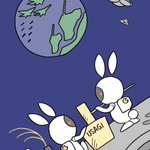 #マンガ #漫画 #まんが #漫画好きな人と繋がりたい #漫画がよめるハッシュタグ #漫画が読めるハッシュタグ #マンガが読めるハッシュタグ #漫画家志望さんと繋がりたい #漫画家志望 #創作漫画 #一コマ漫画 #1コマ漫画 #一コマ 戦火の絶えない地球を月から眺めるウサギを描いた一コマ漫画「おちきゅ見」
