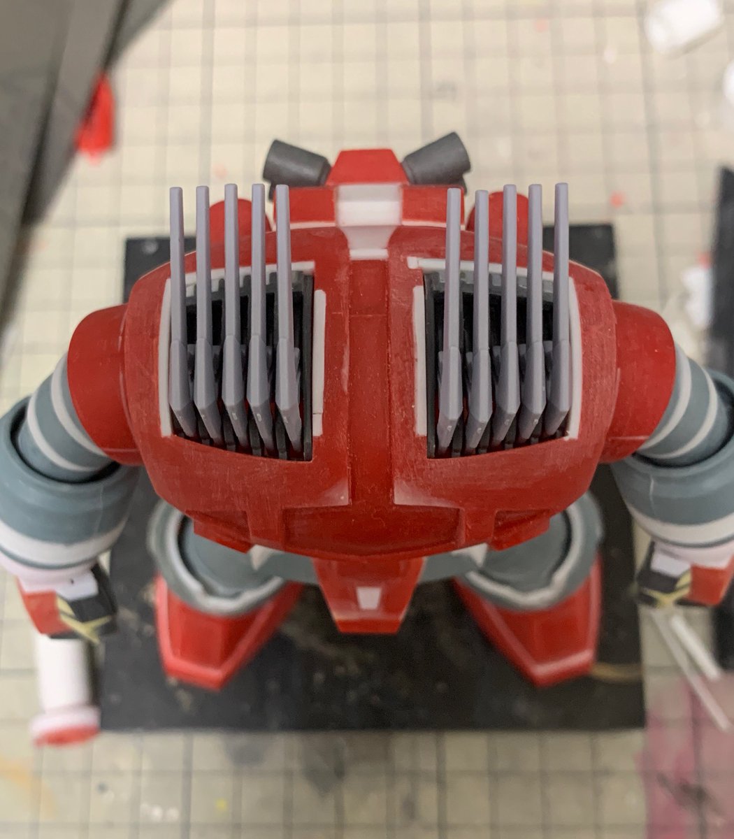 よし!先ずは片モヒいけた!縦ラインのモノアイシールドディテールを平行に拡げたので、その分ユニット位置も外側にずらした。ブーメランはもっとシンプルな形状にする予定。 #一ヶ月戦争vol3 #旧キット #ガンプラ