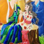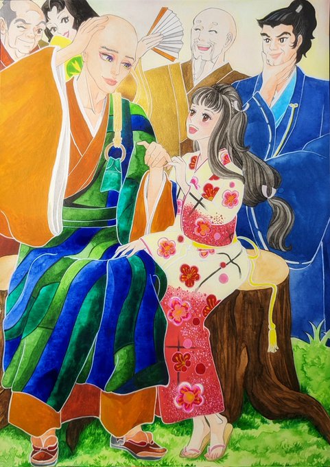 新右衛門さん、出家した将軍様、 桔梗屋さんと弥生さんに見守られ 一休さんはさよちゃんと指切りげんまんで将来を誓います✨💖 (史実の一休は70代頃に妻帯) #一休さん #一休宗純 #ART_RT #ArtistOnTwitter #手描き #イラスト #みんなで楽しむTwitter展覧会