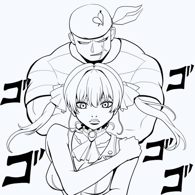 一味お絵描きリレー企画のグループ④にて線画を担当しました! 大航海かんりんまる(@surabudon730)さんのラフ画とスタンド一味のジョジョ風との案でそれっぽくしてみました この線画に柊あおい(@hiragi_aoi212)さんが色を塗ってくれています 次もあれば是非! #一味お絵描きリレー #マリンのお宝