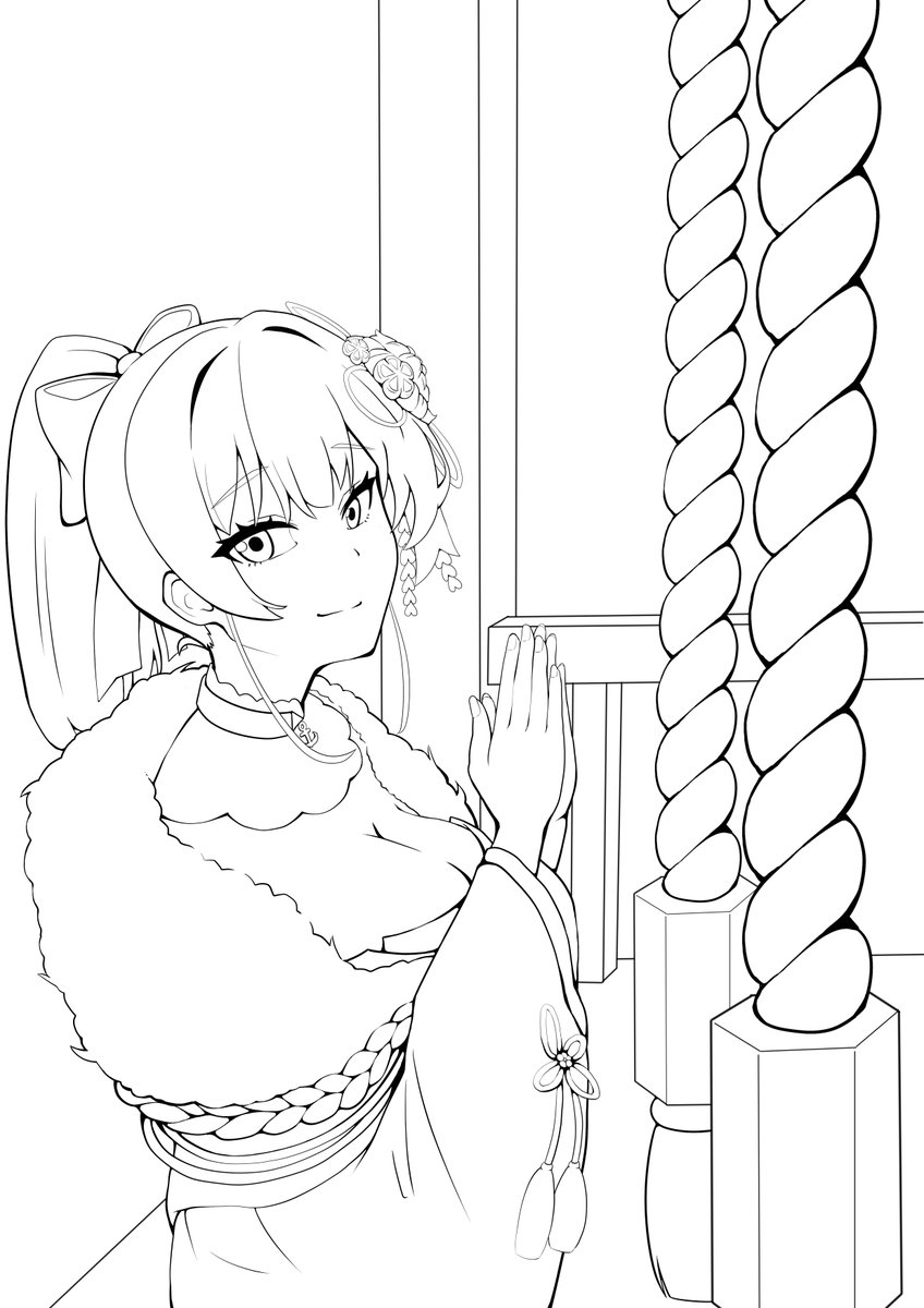 #一味お絵描きリレー 第四回、グループ③お疲れさまでした! 二人で初詣のシチュエーション! ラフ:ゆずさん 線画:えすきー 塗り:山吹オルカさん ラフから構図が完成されていたのでやりやすかったです そして振袖の模様の塗りが素晴らしかったです(自分だと面倒でやらないw)