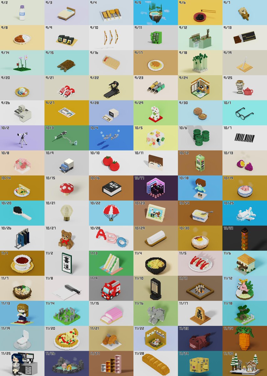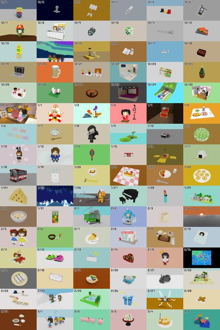 #一日一ボクセル 完! というわけで今まで作った366個の作品をまとめてみました! 1つ1つが小さいので拡大推奨です。 一度は中断してしまったものの、2年掛けて1年分やりきれました!😂 いいねやRT、感想リプしてくれた方ありがとうございます!🙇 #magicavoxel #voxelart