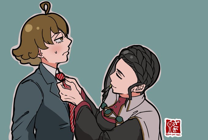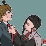 #一柳弓彦版深夜の真剣お絵描き60分一本勝負 フライングですが。 水鏡さんにネクタイ結んでもらう。 ちなみに、主催さんに申請したら感想いただけると聞いたんですけど、申請方法がよく分からなかった…。もし可能であれば頂きたいです。