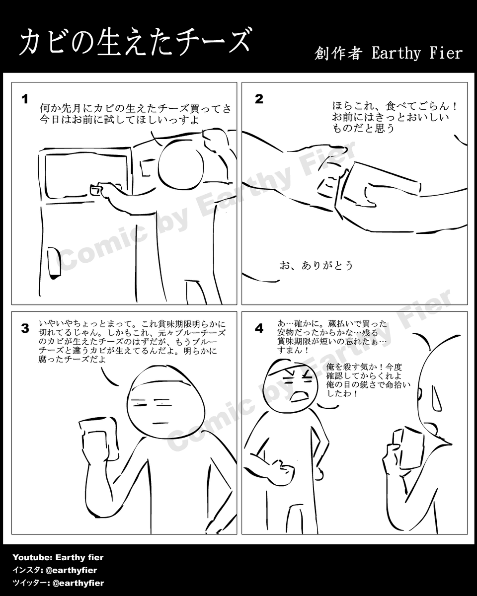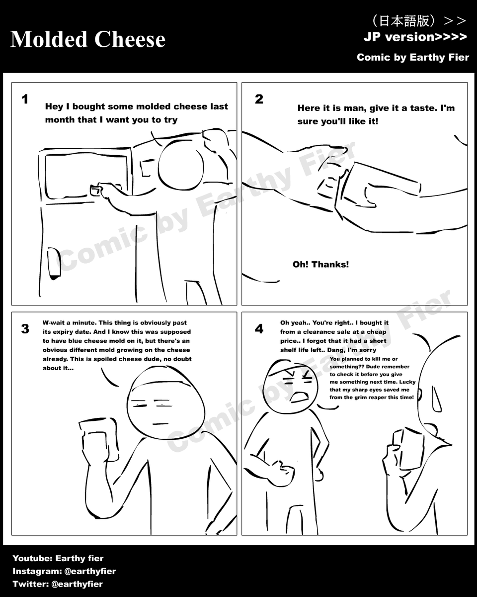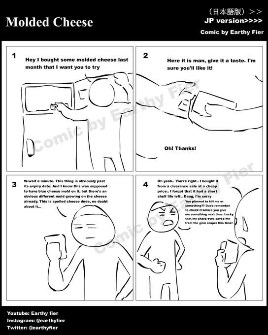 instagram.com/earthyfier/ ^See more 日本語付きの漫画 Multilingual comic EP 467 Molded Cheese カビの生えたチーズ #イラスト #絵描きさんと繋がりたい #みんなで楽しむTwitter展覧会 #漫画が読めるハッシュタグ #4コマ漫画 #comic #一次コミ #Twitter交流会会場 $picrt #落書向上委員会